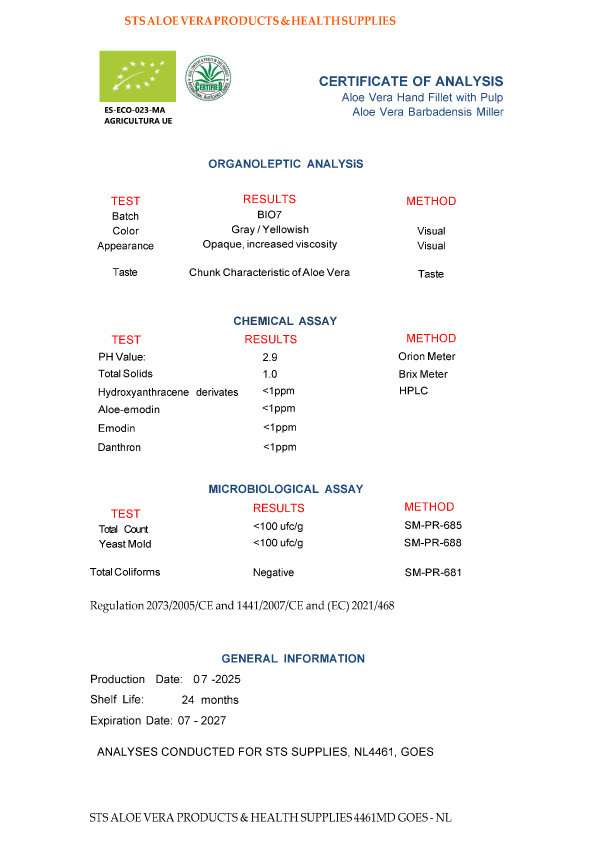 Door verschillende en uitgebreide laboratorium testen garanderen wij u zuivere aloe vera. Om dit te bereiken testen wij dan ook in totaal meer dan 14 dagen de aloë vera op mogelijke verontreiniging voordat deze wordt vrijgeven.